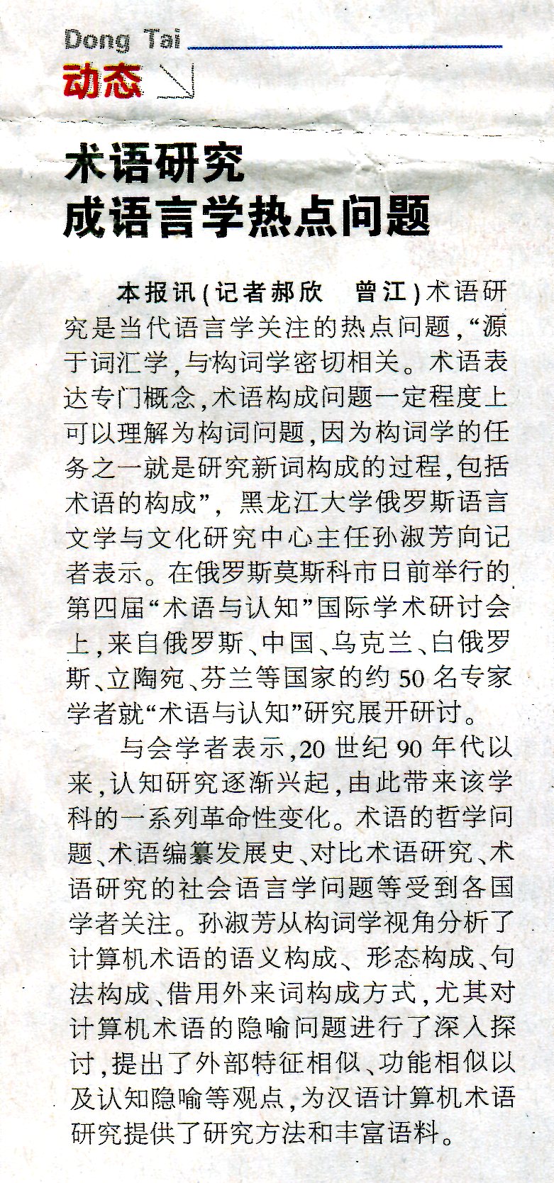 2014年6月18日,《中国社会科学报》与《中国社科网》刊发题为《术语研究成语言学热点问题 》的文章,报道了第四届“术语与认知”国际学术研讨会召开的相关情况,该会议由教育部人文社会科学重点研究基地黑龙江大学俄罗斯语言文学与文化研究中心与俄罗斯科学院维诺格拉多夫俄语研究所共同举办,来自俄罗斯、中国、乌克兰、白俄罗斯、立陶宛、芬兰、等国约50名代表参加此次会议。中心主任孙淑芳教授、叶其松副研究员应邀作为会议主席团成员,其中孙淑芳教授任会议主席、叶其松副研究员任副主席。