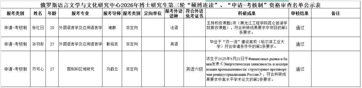 俄研中心2026年博士研究生“硕博连读”“申请-考核制”招生资格审查工作已结束,根据有关要求,对审查通过名单予以公示。