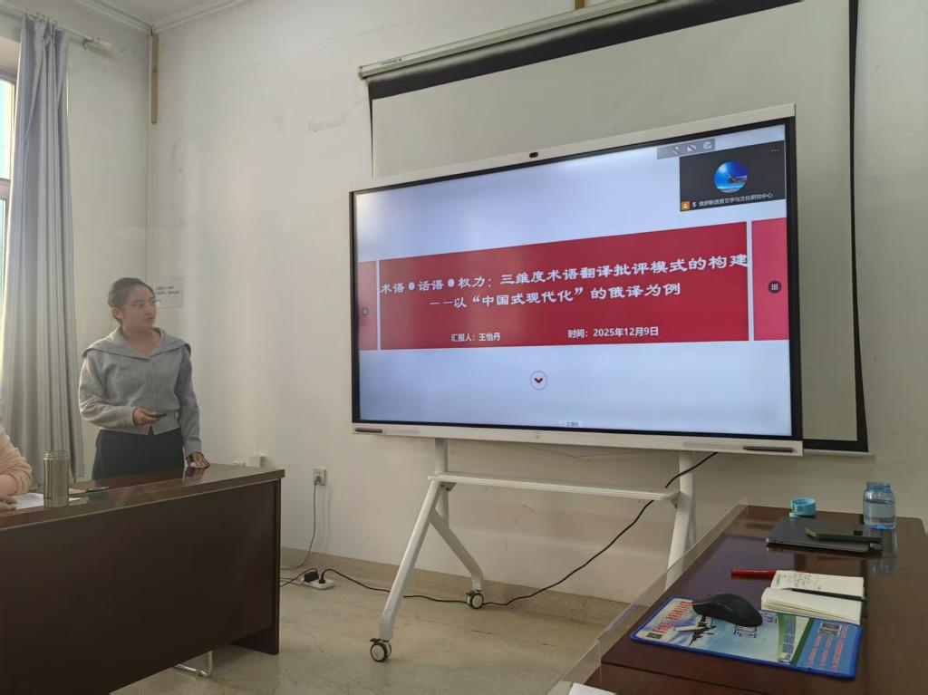 6.中心博士研究生王怡丹作了题为《术语·话语·权力:三维度术语翻译批评模式的构建——以“中国式现代化”的俄译为例》的发言。发言通过对术语、话语和权力三者互动关系的分析,提出三维度术语翻译批评模式,该模式具有动态性、循环性、复杂性、跨学科性和前瞻性,并以中国特色术语“中国式现代化”的俄语翻译为例,对其在俄罗斯主流媒体塔斯社中的传播、使用问题进行了思考。