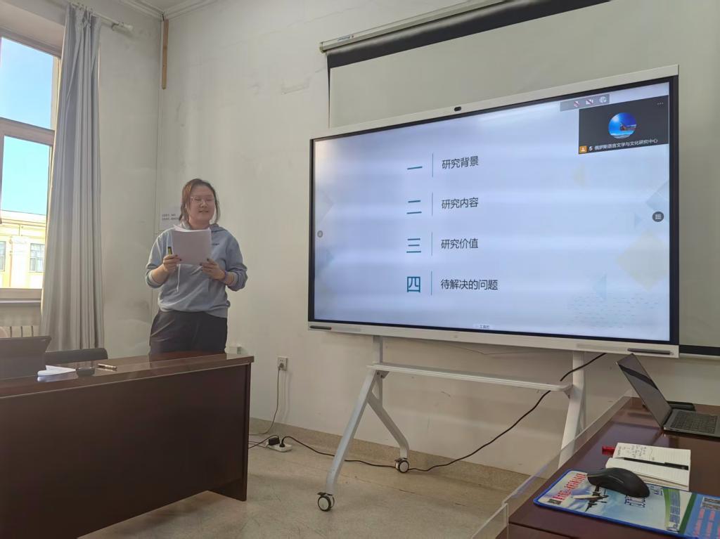 9.中心硕士研究生邢雅欣作了题为《中俄文化年背景下中国东北与俄罗斯远东人文合作:以黑龙江省与阿穆尔州为例》的发言。发言通过对中俄文化年背景下中国东北和俄罗斯远东地区人文合作具体实践的分析,得出了两地活动举办机制化,往来游客数量创新高,彼此文化认同程度不断加深的结论。展望未来,中俄人文合作仍有广阔发展空间。